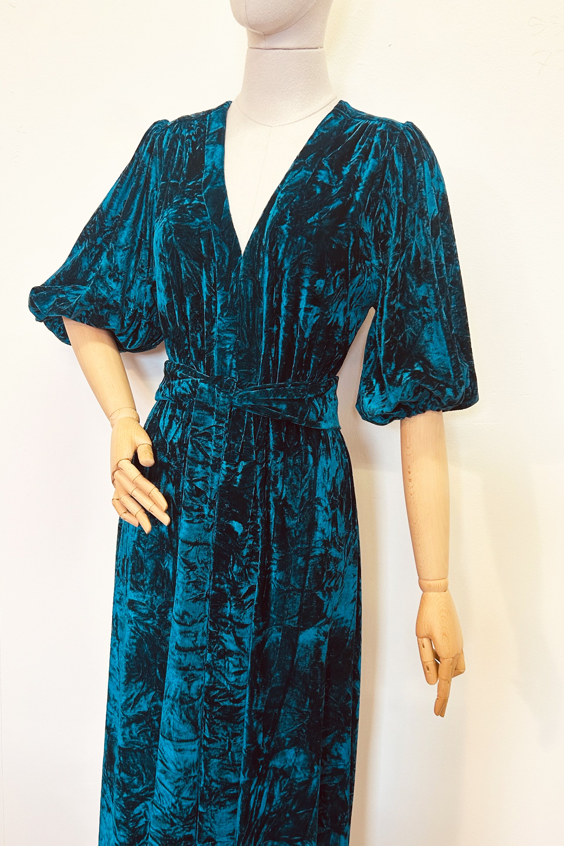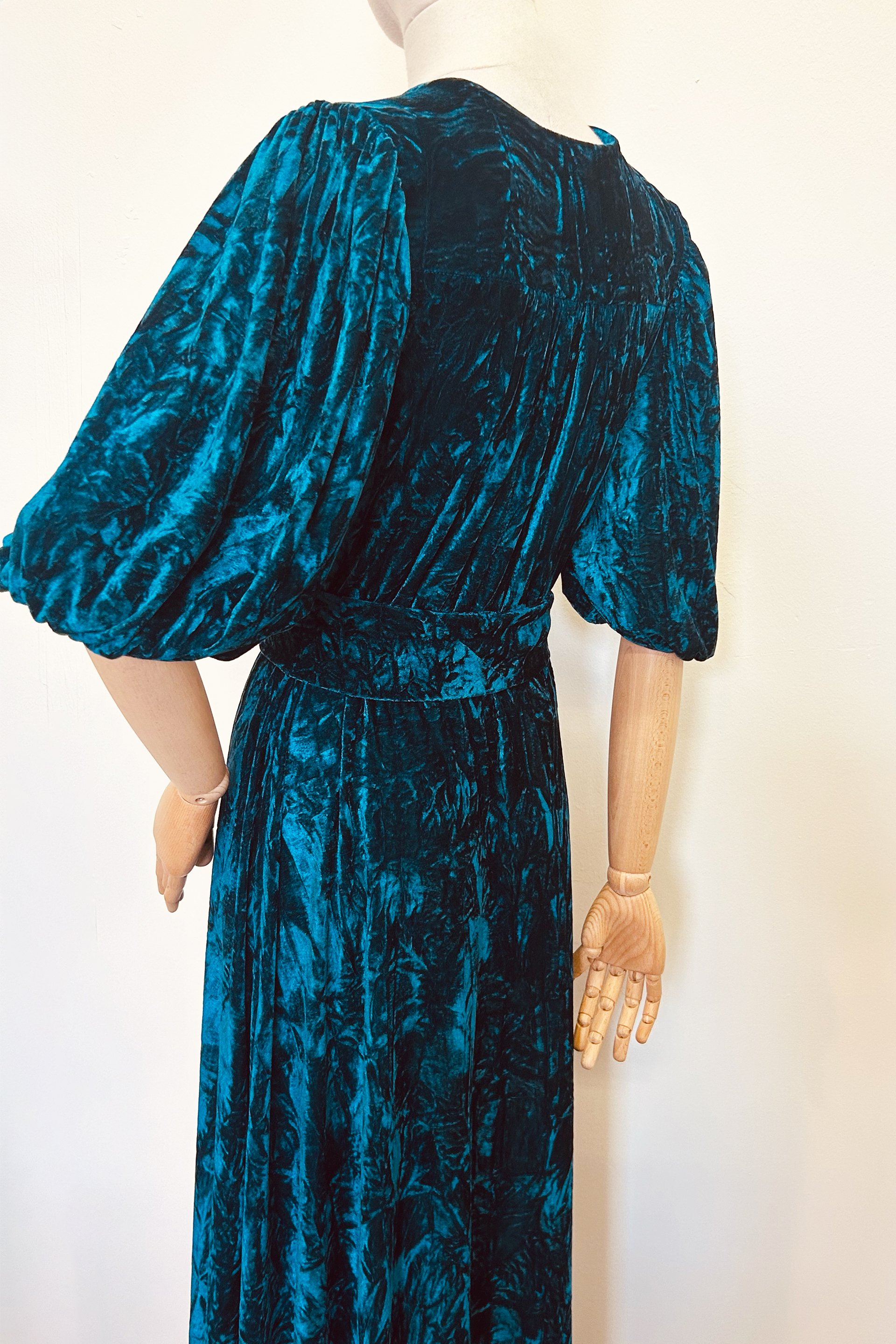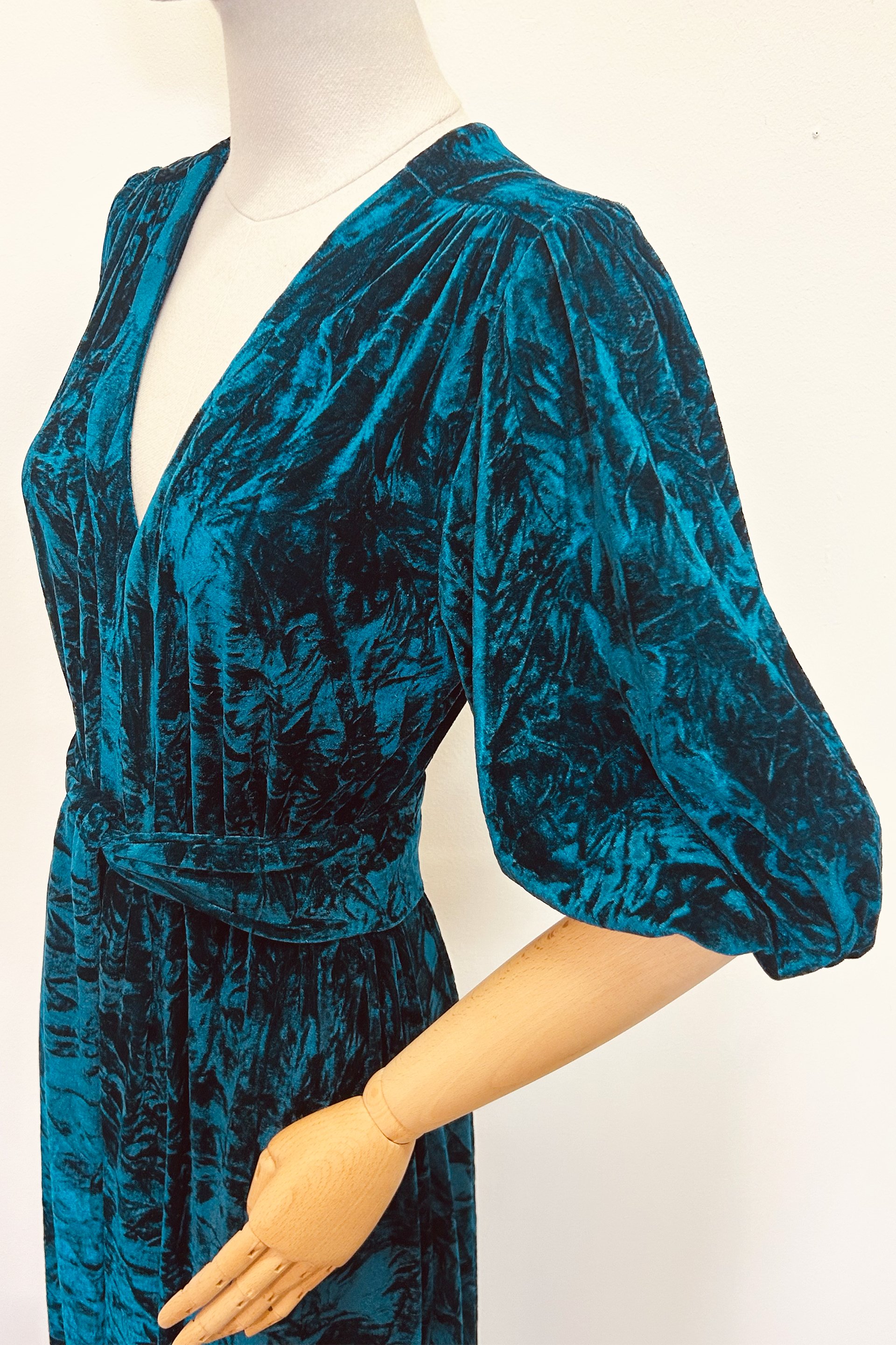 Beautiful balloon-sleeved full-length dress made in the most beautiful soft, crushed, stretch velvet. V-neck with softly gathered waist and split up centre front to just above knee point. Slightly longer at the back for elegance and finished off with a tie belt which can be worn any way you like! Other colours available on request. XS = 6 S = 8-10 M = 12-14 L = 16